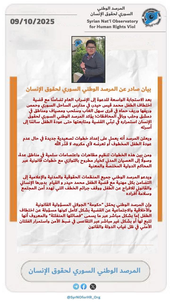 📌 بعد الاستجابة الواسعة للدعوة إلى الإضراب العام تضامنًا مع قضية اختطاف الطفل #محمدقيسحيدر، في مدارس الساحل السوري وحمص وريفها وريف حماه في قرى سهل الغاب وسلحب ومصياف ومناطق في دمشق وحلب وباقي المحافظات؛ يؤكد المرصد الوطني السوري لحقوق الإنسان استمراره في تبنّي القضية ومتابعتها حتى عودة الطفل سالمًا إلى أسرته.