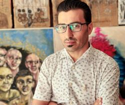 فنان يرسم على “كراتين المساعدات”