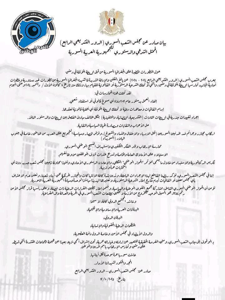 📌 شدد البيان على أن مجلس الشعب عن الدور التشريعي (٢٠٢٤ _ ٢٠٢٨) يعتبر الممثل الدستوري والشرعي الوحيد للشعب السوري.