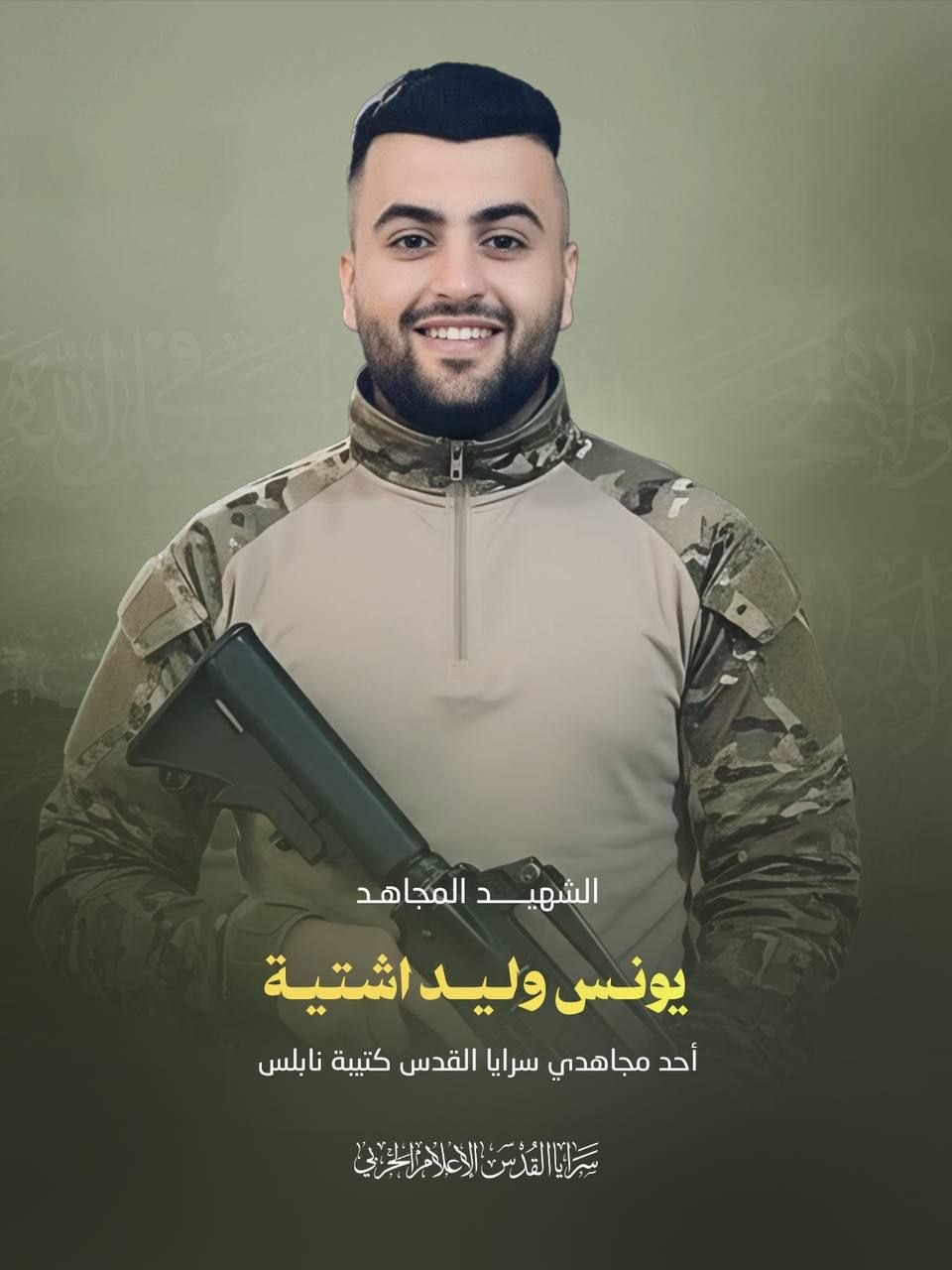 من مجاهدي سرايا القدس كتيبة نابلس ، والذي ارتقى إلى العلا مساء أمس الجمعة 21-11-2025 بعد خوضه اشتباكاً مسلحاً مع قوات العدو التي حاصرته في منزل في قرية تل جنوب غرب نابلس، وتؤكد سرايا القدس أنها ستبقى ثابتة على درب الجهاد والمقاومة حتى التحرير والعودة.