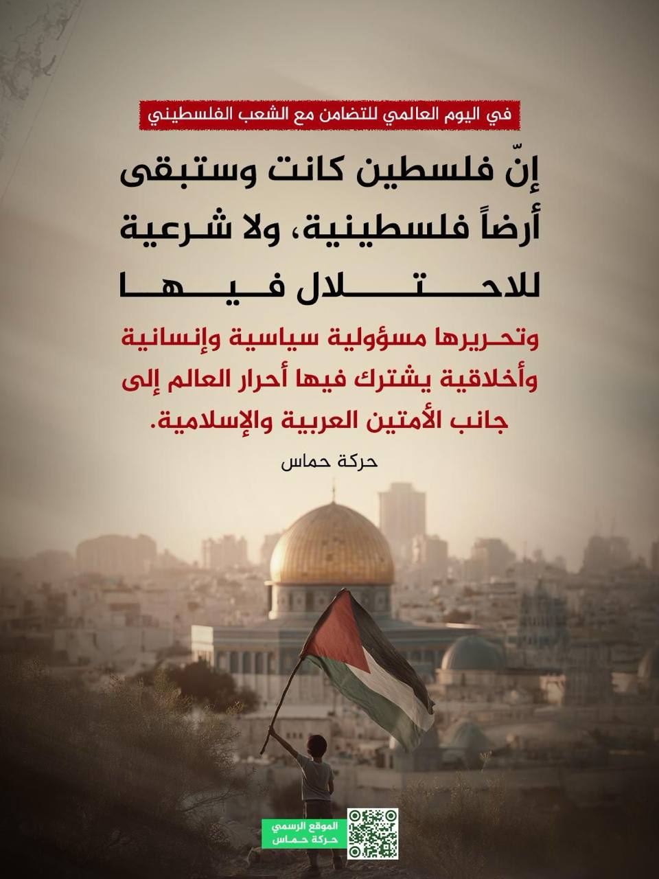 إنَّنا في حركة حماس، وفي اليوم العالمي للتضامن مع الشعب الفلسطيني، المعتمد من قبل الجمعية العامة للأمم المتحدة يوم 29/11 من كلّ عام، نؤكّد ما يلي:
