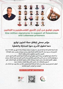 أطلقت الشبكة العالمية “كلنا غزة كلنا فلسطين” حملة المليون توقيع الموجهة للجنة الدولية للصليب الأحمر، للمطالبة بفتح سجون الاحتلال أمام اللجنة طلباً لكشف مصير الأسرى الفلسطينيين واللبنانيين وسائر الأسرى العرب وضمان حقوقهم، والعريضة التي بدأ جمع التواقيع عليها باللغات العربية والانكليزية والفرنسية والروسية والأسبانية سوف يتمّ تقديمها في جنيف مع حلول اليوم العالمي للأسير الفلسطيني في 17 نيسان المقبل من ضمن مجموعة فعاليات منها محكمة شعبية في بروكسل ووقفة في لاهاي أمام المحكمة الجنائية الدولية، إضافة الى تقديم عرائض خطية موقعة يتمّ تقديمها في أكثر من مائة مدينة في العالم ضمن وقفات أمام مقرات الصليب الأحمر الدولي.