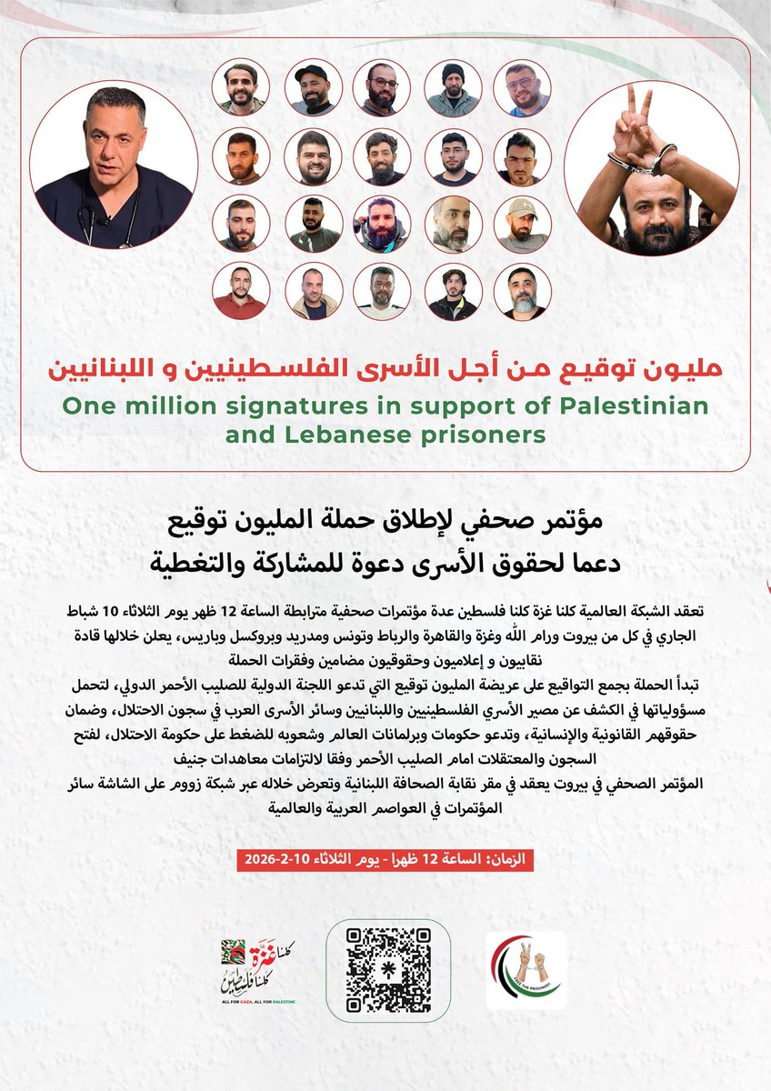 من باريس تحدثت منسقة الشبكة القانونية العالمية لأجل فلسطينالمامية الناشطة د. لينا الطبال، وقالت: نطلق عريضة تهدف إلى جمع مليون توقيع لمطالبة للجنة الدولية للصليب الأحمر بزيارة المعتقلين اللبنانيين والفلسطينيين في السجون الإسرائيلية، معتبرة أنه لا يمكن فصل ملف السجون الإسرائيلية عن الإبادة في غزة،