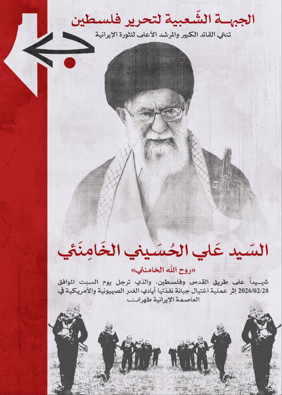 تنعي الجبهة الشعبية لتحرير فلسطين إلى جماهير أمتنا وكافة الأحرار والمناضلين في العالم القائد الكبير السيد عليَّ خامنئي، مرشد وقائد الثورة في إيران، وثلةً من رفاق دربه من القادة العسكريين والسياسيين، الذين ارتقوا في عملية اغتيالٍ إجراميةٍ غادرةٍ نفذتها قوى التحالف الصهيوني–الإمبريالي.