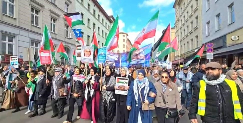 وفي برلين، وبدعوة من اللجنة الوطنية الفلسطينية الموحدة في المدينة، نُظّمت الأحد 1 مارس/آذار 2026 مظاهرة جماهيرية تضامنًا مع الشعب الفلسطيني، وتنديدًا بالعدوان الصهيوني–الأمريكي على إيران والمنطقة، بمشاركة واسعة من أبناء الجاليات العربية والفلسطينية، إلى جانب مجموعات ألمانية مناهضة للإمبريالية والصهيونية وحركات تضامن أوروبية.
