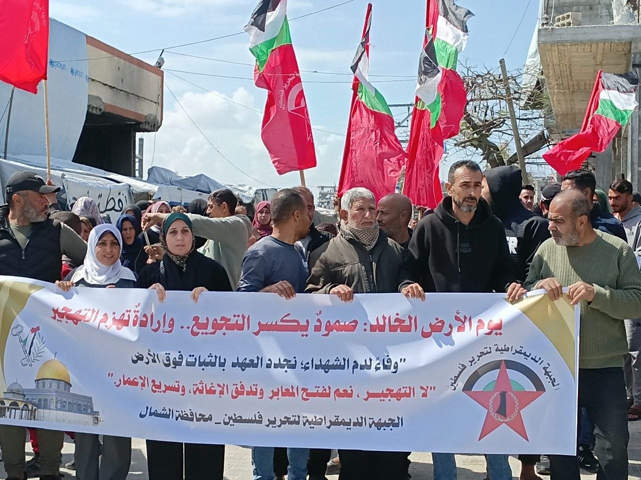 في مشهد جماهيري حمل دلالات سياسية ووطنية واسعة، أحيت الجبهة الديمقراطية لتحرير فلسطين، اليوم الاثنين، الذكرى السنوية لـيوم الأرض الخالد بتنظيم مسيرة حاشدة في مخيم جباليا شمال قطاع غزة، وسط دعوات متجددة لوقف الحرب، وفتح المعابر، وتسريع جهود الإغاثة وإعادة الإعمار.