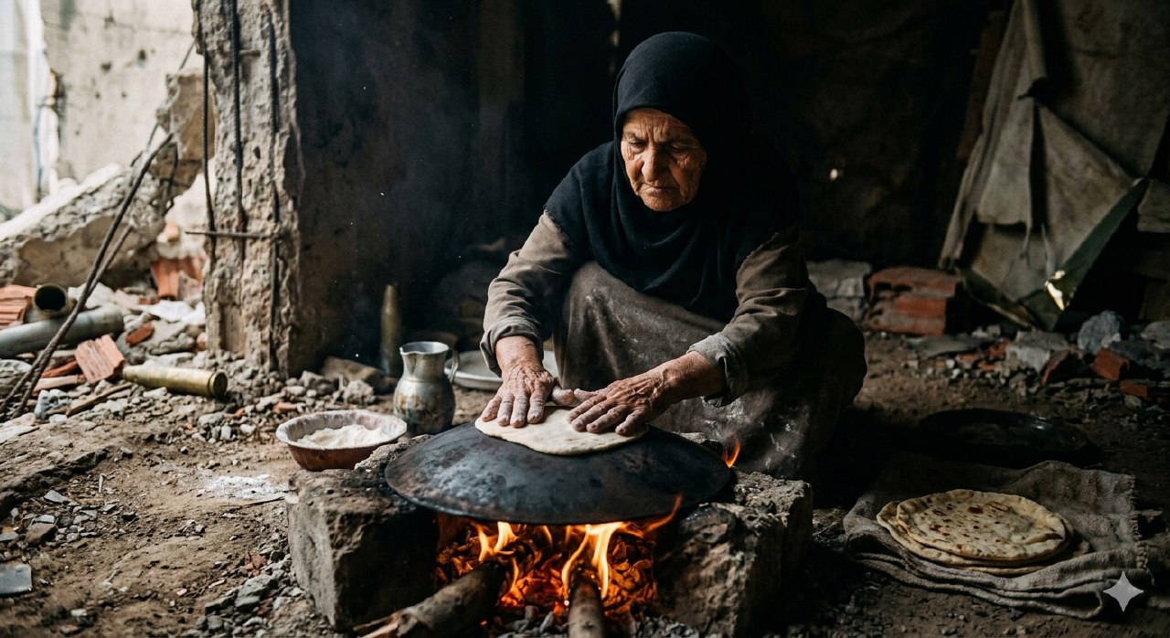 عجوز في الثمانين، تعجن الطحين على ضوء شمعة، وتخبز على صاجٍ صغير داخل حفرة، تخفي دخانها عن عيون الطائرات، ثم تزحف في العتمة لتوصل خبزها إلى من يقفون في وجه الموت.