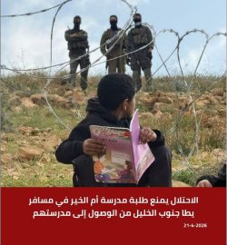 وتعود الصورة لطفل فلسطيني من مدرسة أم الخير في مسافر يطا جنوب الخليل، منعه جنود الاحتلال، قبل أيام، مع باقي التلاميذ، من الوصول إلى مدرستهم، في مشهد وثّقته تقارير إعلامية ونشطاء على منصات التواصل.